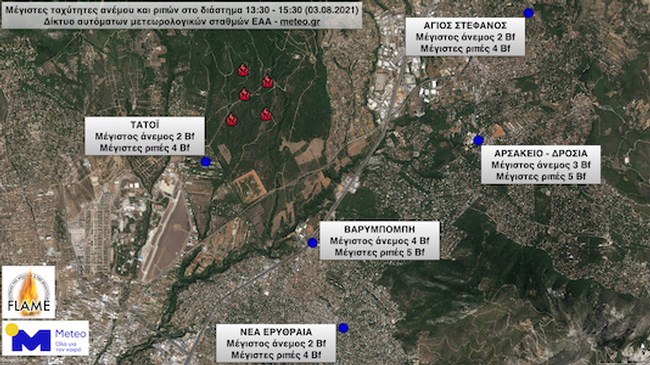 Όταν εκδηλώθηκε η δασική πυρκαγιά, το μεσημέρι (13:25) της Τρίτης στους πρόποδες της Πάρνηθας, καθώς και κατά τη διάρκεια των πρώτων δύο ωρών της εξάπλωσής της (13:30 – 15:30), στην ευρύτερη περιοχή έπνεαν άνεμοι με μέσες εντάσεις 2 – 4 μποφόρ και ριπές ως 5 μποφόρ, προκύπτει από τις μετρήσεις των αυτόματων μετεωρολογικών σταθμών του δικτύου του Εθνικού Αστεροσκοπείου Αθηνών (ΕΑΑ) – meteo.gr.