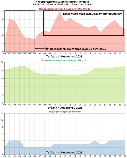 Σε ό,τι αφορά την εξέλιξη των πυρομετεωρολογικών συνθηκών στην ευρύτερη περιοχή της δασικής πυρκαγιάς, τα τελευταία διαθέσιμα προγνωστικά στοιχεία του ΕΑΑ – meteo.gr δείχνουν βελτιωμένες συνθήκες ως νωρίς το πρωί σήμερα, με επιδείνωση όμως από νωρίς το μεσημέρι και προς το απόγευμα, οπότε και αναμένεται ενίσχυση των ανέμων.