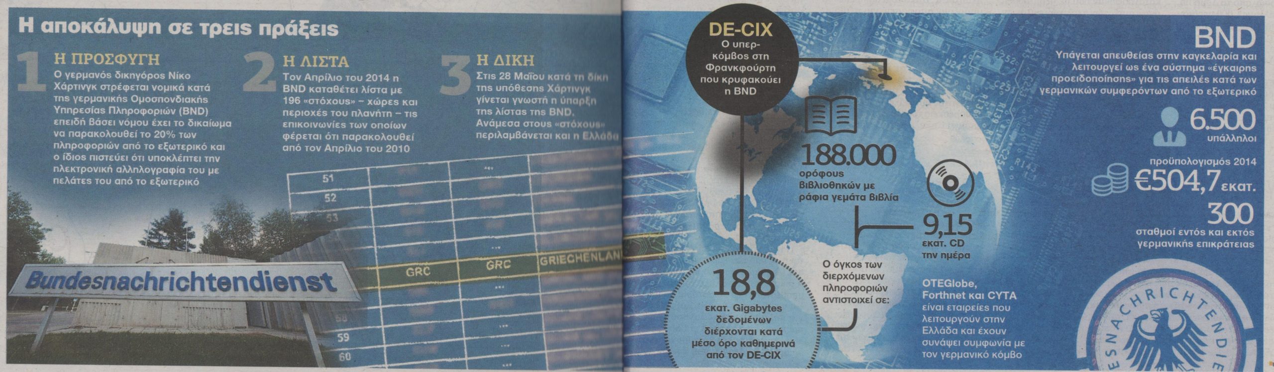 Ηλεκτρονικά μηνύματα και τηλεπικοινωνίες μέσω Internet από την Ελλάδα παρακολουθεί η γερμανική Ομοσπονδιακή Υπηρεσία Πληροφοριών (BND), σύμφωνα με έγγραφα που έχει στην κατοχή της η εφημερίδα Τα Νέα.