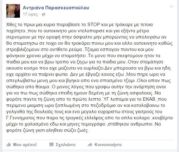 ΥΓ λυπάμαι για το ΕΚΑΒ, που περίμενα μιάμιση ώρα ξαπλωμένη στο πεζοδρόμιο αν και καταλαβαίνω το γολγοθά της δουλειάς τους και ένα μεγάλο ευχαριστώ στους γιατρούς του Γ.Γεννηματάς που παρά τις τραγικές ελλείψεις απο τα απλά κολάρο, κουβέρτα μέχρι το χαλασμένο εδώ και μήνες τομογράφο, στάθηκαν άνθρωποι. Να φοράτε ζώνη γιατι αλήθεια σώζει ζωές».