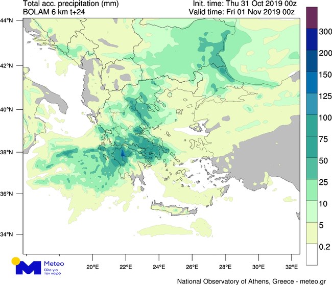 Στον χάρτη που ακολουθεί παρουσιάζεται ο ολικός υετός (βροχή/χαλάζι/χιόνι) που αναμένεται έως σήμερα το βράδυ.