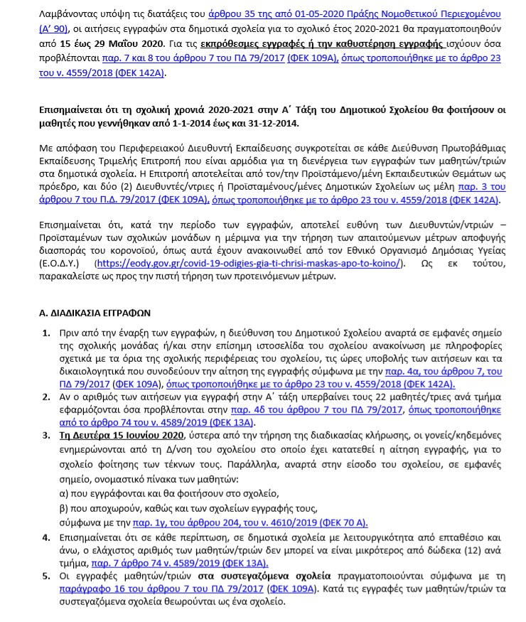 Για τα Δημοτικά Σχολεία οι αιτήσεις εγγραφής για το σχολικό έτος 2020-2021 θα πραγματοποιηθούν από 15 έως 29 Μαΐου 2020.