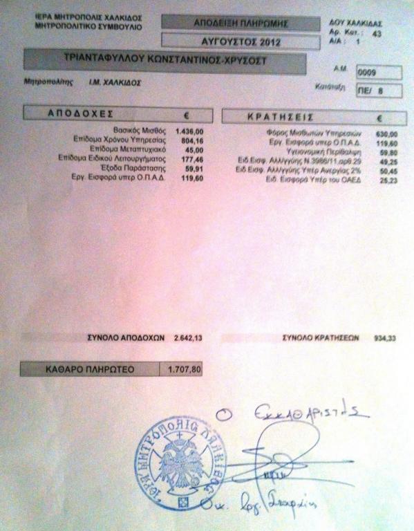 Με αφορμή και τις πληροφορίες που βλέπουν το φως της δημοσιότητας για το ύψος των αποδοχών των Αρχιερέων η Μητρόπολη Χαλκίδος με ανακοίνωσή της έδωσε στη δημοσιότητα στοιχεία για τη μισθοδοσία του επιχώριου Μητροπολίτη κ. Χρυσοστόμου.Σύμφωνα με ανακοίνωση της, «οι καθαρές μηνιαίες αποδοχές του Σεβασμιωτάτου είναι 1.707,80 €. Οι αποδοχές αυτές, πριν την εφαρμογή του Μνημονίου (Ιούνιος 2009) έφθαναν το ποσό των 2.135,16 €, στο οποίο έγιναν περικοπές, όπως και σε όλους τους δημοσίους λειτουργούς».Την ανάλυση της μισθοδοσίας μπορείτε να δείτε παρακάτω, όπως τη δημοσιοποίησε η Μητρόπολη Χαλκίδος.