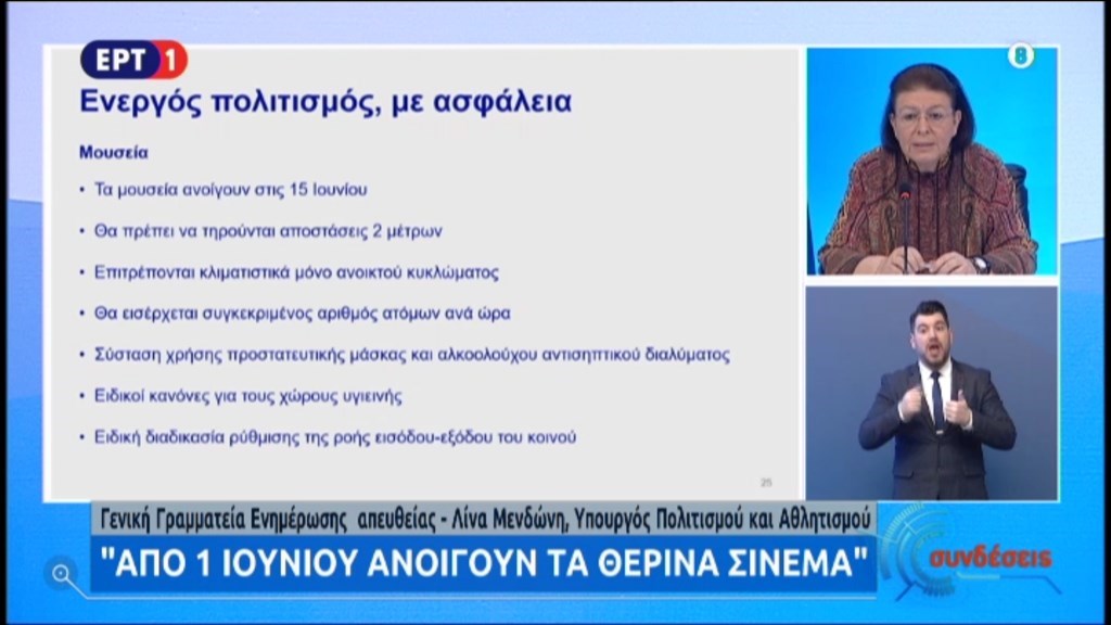 Τις ημερομηνίες για το άνοιγμα των αρχαιολογικών χώρων και των μουσείων ανακοίνωσε η υπουργός Πολιτισμού Λίνα Μενδώνη. Δίνοντας το χρονοδιάγραμμα για την επανεκκίνηση του Πολιτισμού, είπε πως από 18 Μαΐου ανοίγουν αρχαιολογικοί χώροι κλπ. με μέτρα ασφαλείας, περιορισμένο αριθμό προσερχομένων, κανόνες υγιεινής κλπ. Συγκεκριμένα θα πρέπει να τηρούνται αποστάσεις 1,5 μέτρου, ενώ θα γίνεται σύσταση για χρήση προστατευτικής μάσκας και αντισηπτικού διαλύματος. Έως 18 Μαΐου θα έχουν εκδοθεί τα πρωτόκολλα ασφαλείας. Τα μουσεία θα ανοίξουν από τις 15 Ιουνίου με παρόμοιους κανόνες . Στα μουσεία θα πρέπει να τηρούνται αποστάσεις 2 μέτρων, θα εισέρχεται συγκεκριμένος αριθμός ατόμων ανά ώρα, ενώ θα επιτρέπονται κλιματιστικά μόνο ανοικτού κυκλώματος.