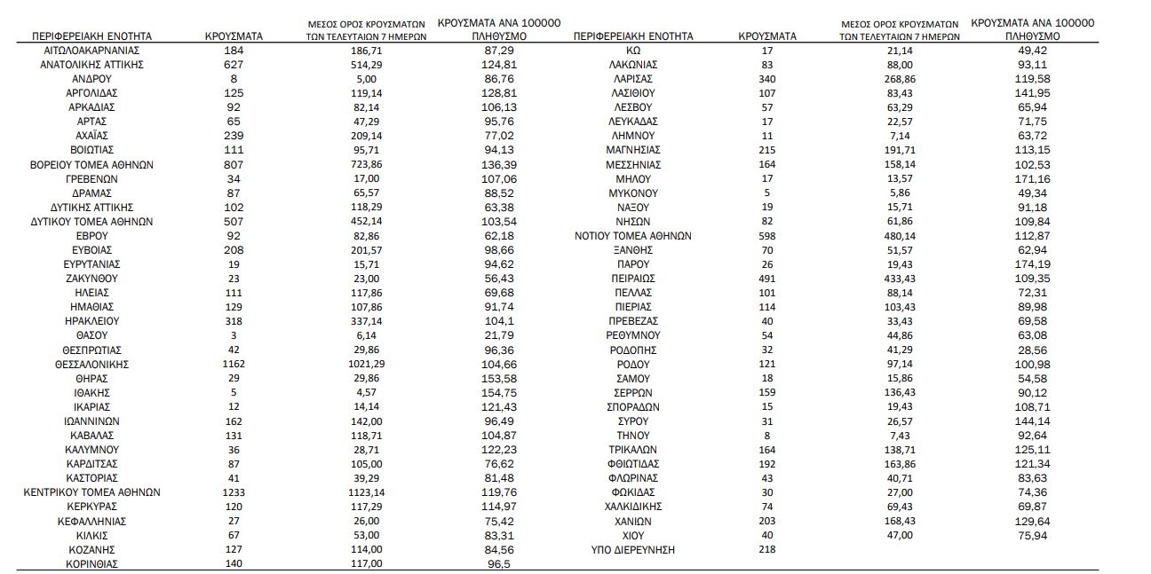 Αναλυτικά η κατανομή των 11.288 νέων εγχώριων κρουσμάτων ανά Περιφερειακή Ενότητα: