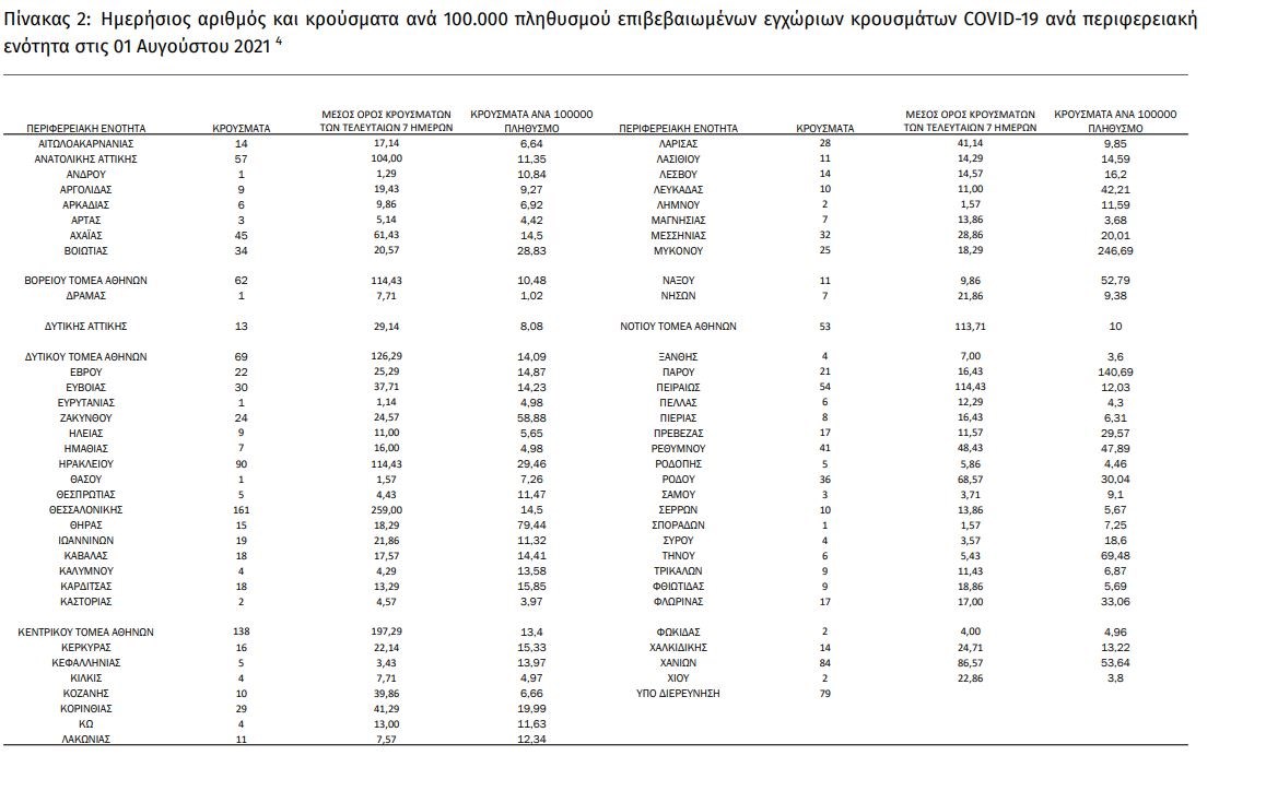 Η κατανομή των 1.589 νέων εγχώριων κρουσμάτων ανά Περιφερειακή Ενότητα παρουσιάζεται στον παρακάτω πίνακα: