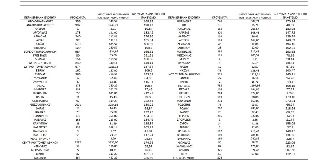 Αναλυτικά η κατανομή των 17.601 νέων εγχώριων κρουσμάτων ανά Περιφερειακή Ενότητα: