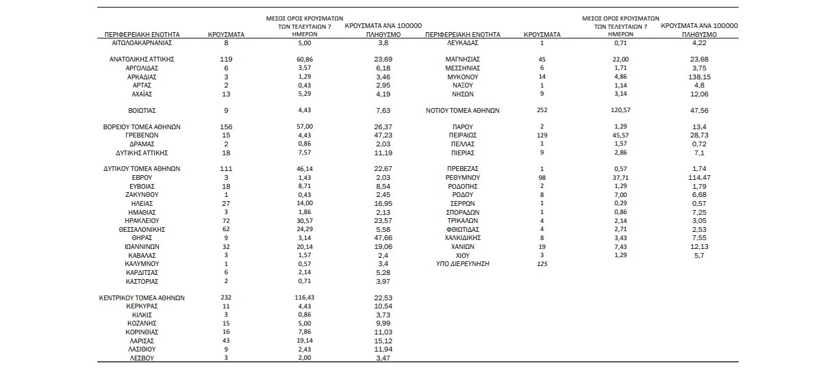 Έτσι βάσει της κατανομής των 1.776 νέων εγχώριων κρουσμάτων, τα 1.026 εντοπίστηκαν στο Λεκανοπέδιο, 62 στη Θεσσαλονίκη, ενώ υπάρχουν κι άλλες αρκετές περιφερειακές ενότητες με διψήφιο αριθμό. Συγκεκριμένα, διψήφιο αριθμό κρουσμάτων κατέγραψαν η Αχαΐα (13), τα Γρεβενά (15), Εύβοια (18), η Ηλεία (27), το Ηράκλειο (72), τα Ιωάννινα (32), η Κέρκυρα (11), Κοζάνη (15), η Κορινθία (16), η Λάρισα (43), η Μαγνησία (45), η Μύκονος (14), το Ρέθυμνο (98), τα Χανιά (19), ενώ 125 τελούν υπό διερεύνηση. Επί της ουσίας, η Κρήτη κατέγραψε 198 νέα κρούσματα, αν συνυπολογίσει κανείς και τα 9 στο Λασίθι.