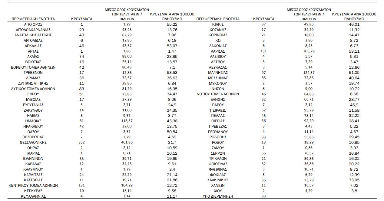 Στην Αττική το τελευταίο 24ωρο εντοπίστηκαν 413 νέες μολύνσεις και ακολουθεί η Θεσσαλονίκη με 352. Ανησυχητική παραμένει η κατάσταση στη Λάρισα, στην οποία καταγράφηκαν 151 νέα κρούσματα.
