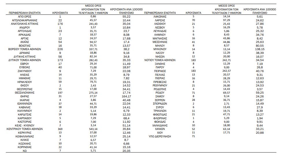 Η κατανομή των 2.644 νέων εγχώριων κρουσμάτων ανά Περιφερειακή Ενότητα παρουσιάζεται στον κατωτέρω πίνακα.