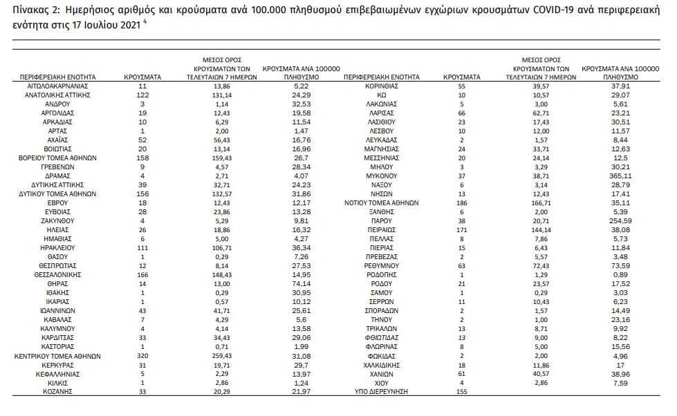 Η κατανομή των 2.545 νέων εγχώριων κρουσμάτων ανά Περιφερειακή Ενότητα παρουσιάζεται στον παρακάτω πίνακα: