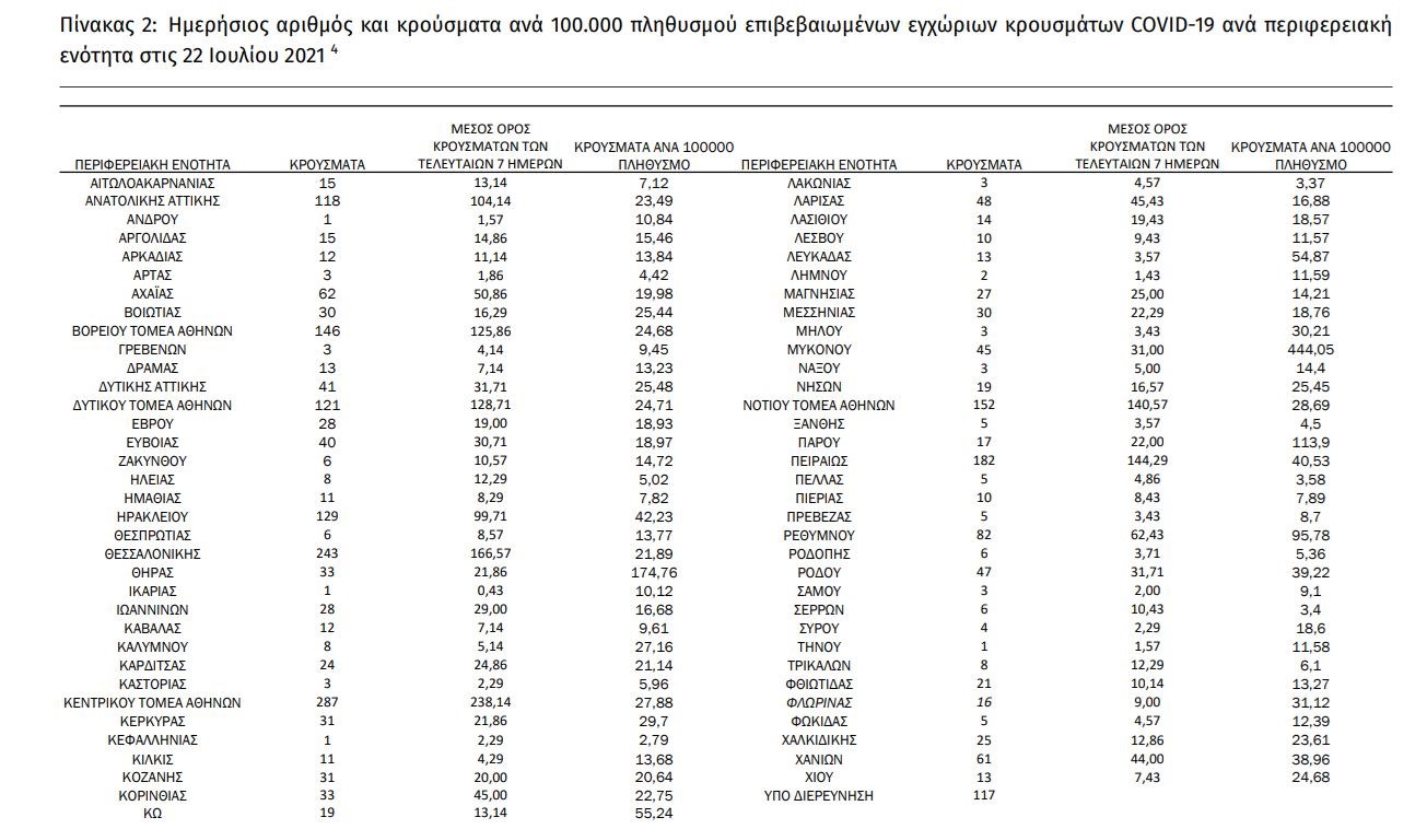 Σε ό,τι αφορά τα νησιά, στη Σαντορίνη εντοπίστηκαν 33 κρούσματα, στην Κέρκυρα 31, στην Κω 19, στη Λέσβο 10, στη Λευκάδα 13, στη Μύκονο 45, στην Πάρο 17, στη Ρόδο 47 και στη Χίο 13.