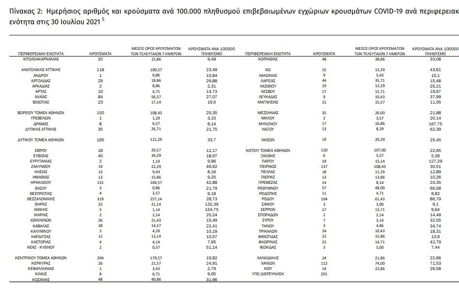Η κατανομή των 2.823 νέων εγχώριων κρουσμάτων ανά Περιφερειακή Ενότητα παρουσιάζεται στον παρακάτω πίνακα: