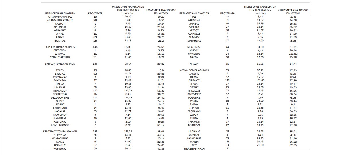 Υψηλοί, όμως, είναι οι αριθμοί και στην Κρήτη, όπου καταγράφηκαν 371 νέα κρούσματα. Συγκεκριμένα, εντοπίστηκαν 157 στο Ηράκλειο, 27 στο Λασίθι, 52 στο Ρέθυμνο και 135 στα Χανιά.