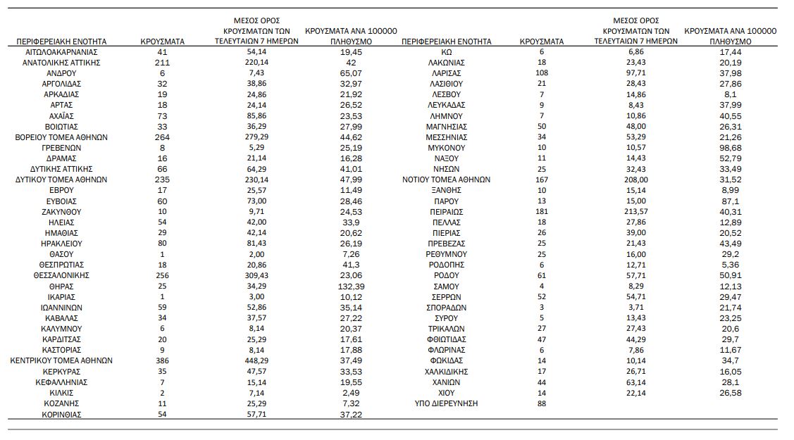 Η κατανομή των 3.355 νέων εγχώριων κρουσμάτων ανά Περιφερειακή Ενότητα παρουσιάζεται στον κατωτέρω πίνακα