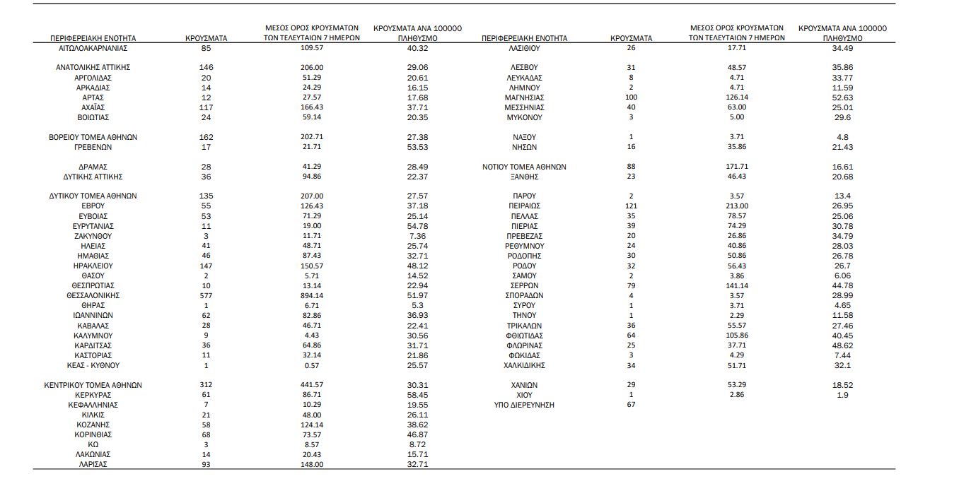 Αναλυτικά κατανομή των 3.513 νέων εγχώριων κρουσμάτων ανά Περιφέρεια