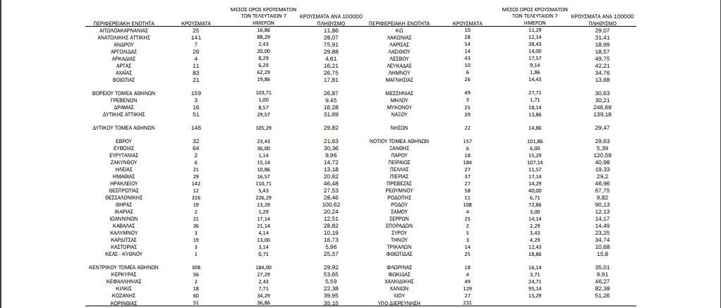 Από το σύνολό τους, 21 είναι εισαγόμενα εκ των οποίων 14 εντοπίστηκαν κατόπιν ελέγχων στις πύλες εισόδου της χώρας. Έτσι βάσει της κατανομής των 3.407 νέων εγχώριων κρουσμάτων, τα 1.168 εντοπίστηκαν στην Αττική, τα 316 στη Θεσσαλονίκη, ενώ εξαιρετικά υψηλοί είναι οι αριθμοί που καταγράφονται στην Κρήτη (343) και στη Ρόδο (108). Σύμφωνα με την κατανομή για την Κρήτη, στο Ρέθυμνο έχουν εντοπιστεί 58 κρούσματα, στο Λασίθι 14, στο Ηράκλειο 142 και στα Χανιά 129.