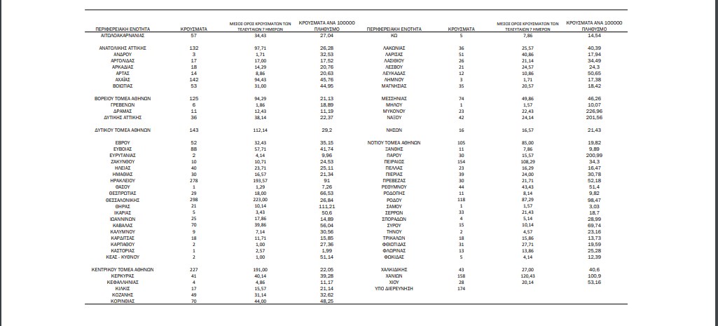 Στο “κόκκινο” παραμένουν Αττική, Θεσσαλονίκη, Κρήτη και Ρόδος. Ο ΕΟΔΥ ανακοίνωσε την Πέμπτη 3.605 νέα κρούσματα κορονοϊού, 24 είναι εισαγόμενα εκ των οποίων 14 εντοπίστηκαν κατόπιν ελέγχων στις πύλες εισόδου της χώρας. Έτσι βάσει της κατανομής των 3.581 νέων εγχώριων κρουσμάτων, τα 938 εντοπίστηκαν στην Αττική, 298 στη Θεσσαλονίκη, 118 στη Ρόδο, ενώ 506 καταγράφηκαν στην Κρήτη. Συγκεκριμένα, 278 στο Ηράκλειο, 158 στα Χανιά, 26 στο Λασίθι και 44 στο Ρέθυμνο.
