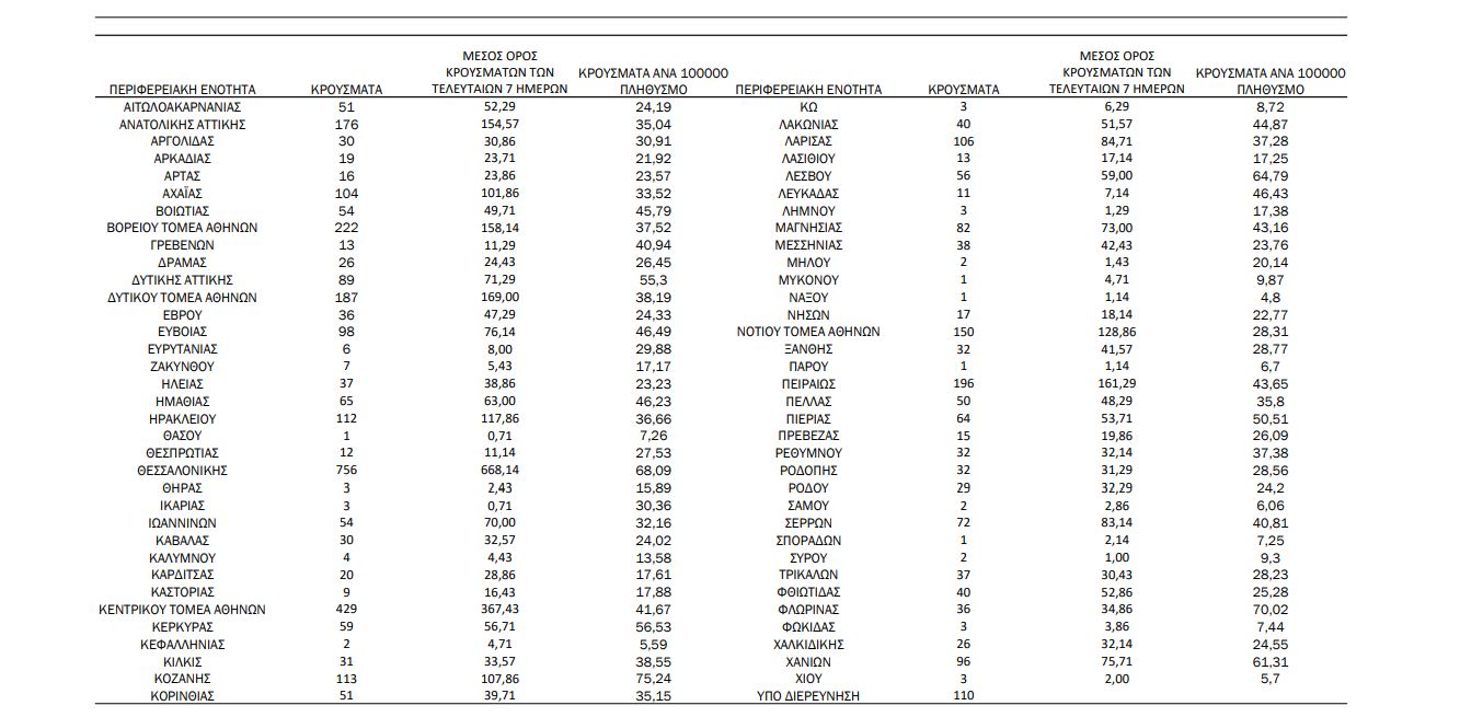 Αναλυτικά η κατανομή των 4.327 νέων εγχώριων κρουσμάτων ανά Περιφερειακή Ενότητα: