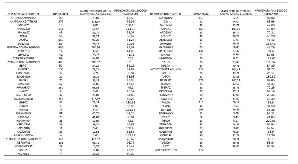 Η κατανομή των 7.056 νέων εγχώριων κρουσμάτων ανά Περιφερειακή Ενότητα παρουσιάζεται στον κατωτέρω πίνακα