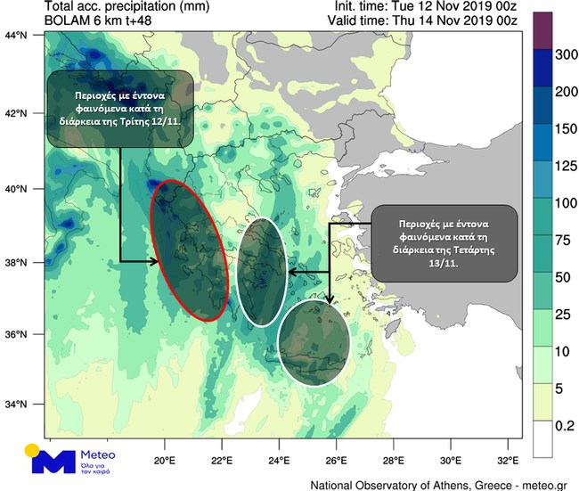 Στον χάρτη που ακολουθεί, παρουσιάζονται το εκτιμώμενο αθροιστικό ύψος βροχής έως τις βραδινές ώρες της Τετάρτης, καθώς επίσης και οι περιοχές όπου αναμένονται τα έντονα φαινόμενα κατά τη διάρκεια του διημέρου. Παράλληλα, οι ατμοσφαιρικές συνθήκες ευνοούν τη μεταφορά σκόνης από τη Βόρεια Αφρική, με αποτέλεσμα τη δημιουργία του φαινομένου της λασποβροχής.