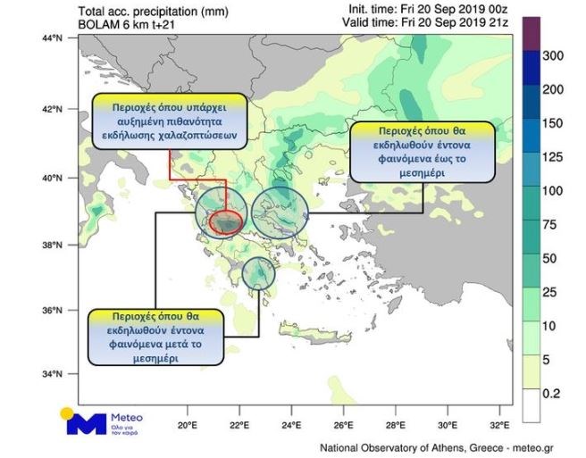 Στον χάρτη παρουσιάζονται τα εκτιμώμενα αθροιστικά ύψη βροχής κατά τη διάρκεια της ημέρας. Με κύκλους σημειώνονται οι περιοχές όπου αναμένονται έντονα φαινόμενα και χαλαζοπτώσεις.