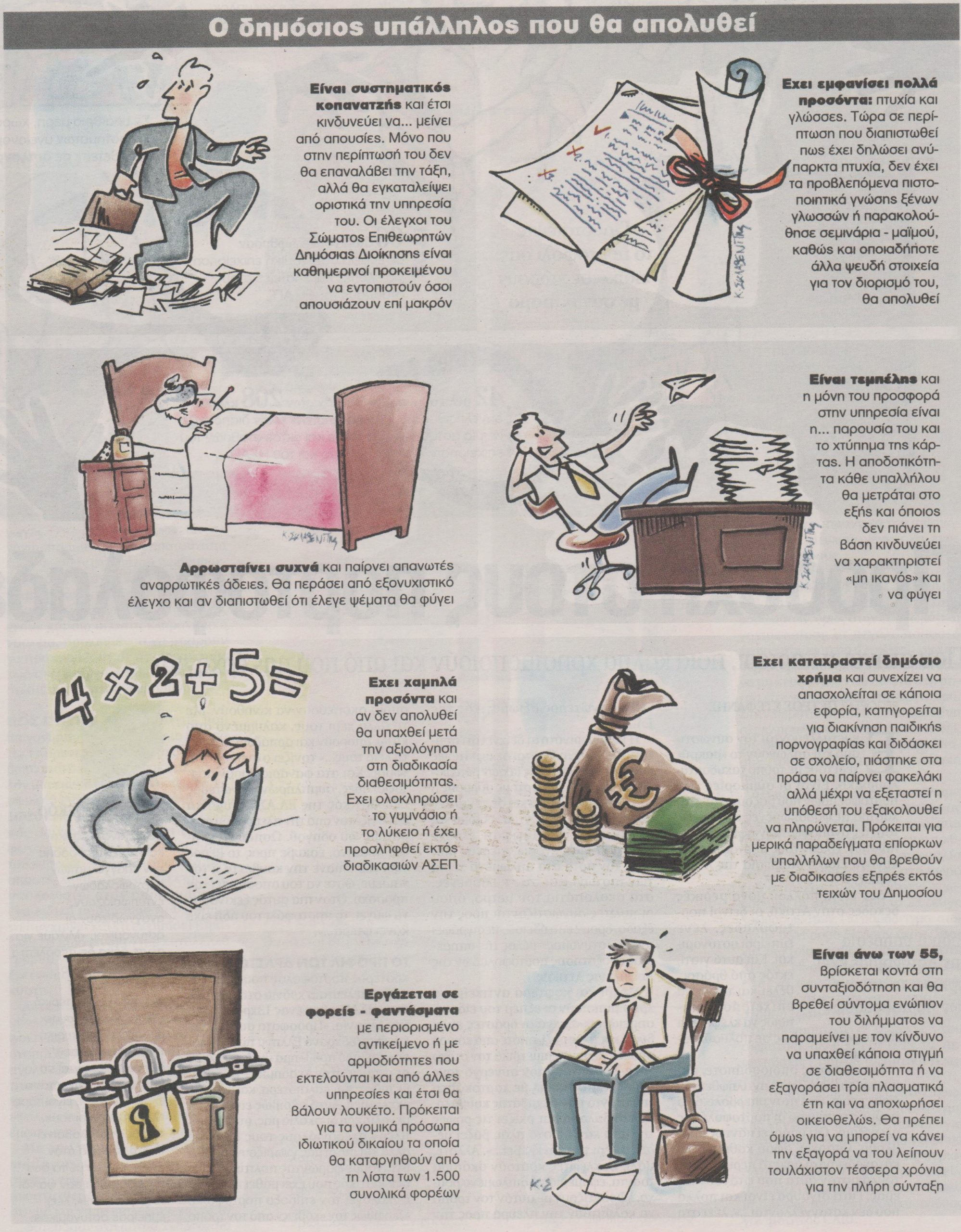 Τις δεξαμενές των υπό απόλυση ή διαθεσιμότητα υπαλλήλων επιχειρεί να οριστικοποιήσει το υπουργείο Διοικητικής Μεταρρύθμισης, στο πλαίσιο του ευρύτερου σχεδιασμού αναδιάρθρωσης του Δημοσίου, το οποίο περιλαμβάνει τα νέα οργανογράμματα-είναι ήδη έτοιμα για τα υπουργεία και οδηγούν σε μείωση κατά μέσον όρο 50% των δομών-, τη διαδικασία στοχοθεσίας και αξιολόγησης για όλες τις υπηρεσίες, καθώς και την επιτάχυνση των πειθαρχικών υποθέσεων που συνδέονται με επίορκους, αδικαιολογήτως απόντες και με πλαστά δικαιλογητικά εργαζόμενους.
