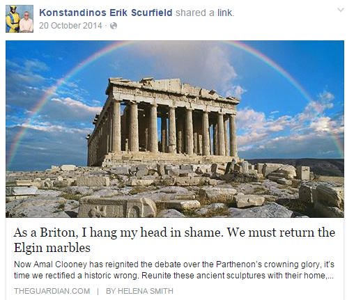 Μάλιστα είχε αναρτήσει και άρθρο από την ιστοσελίδα του Guardian για επιστροφή των Γλυπτών του Παρθενώνα στην Αθήνα.