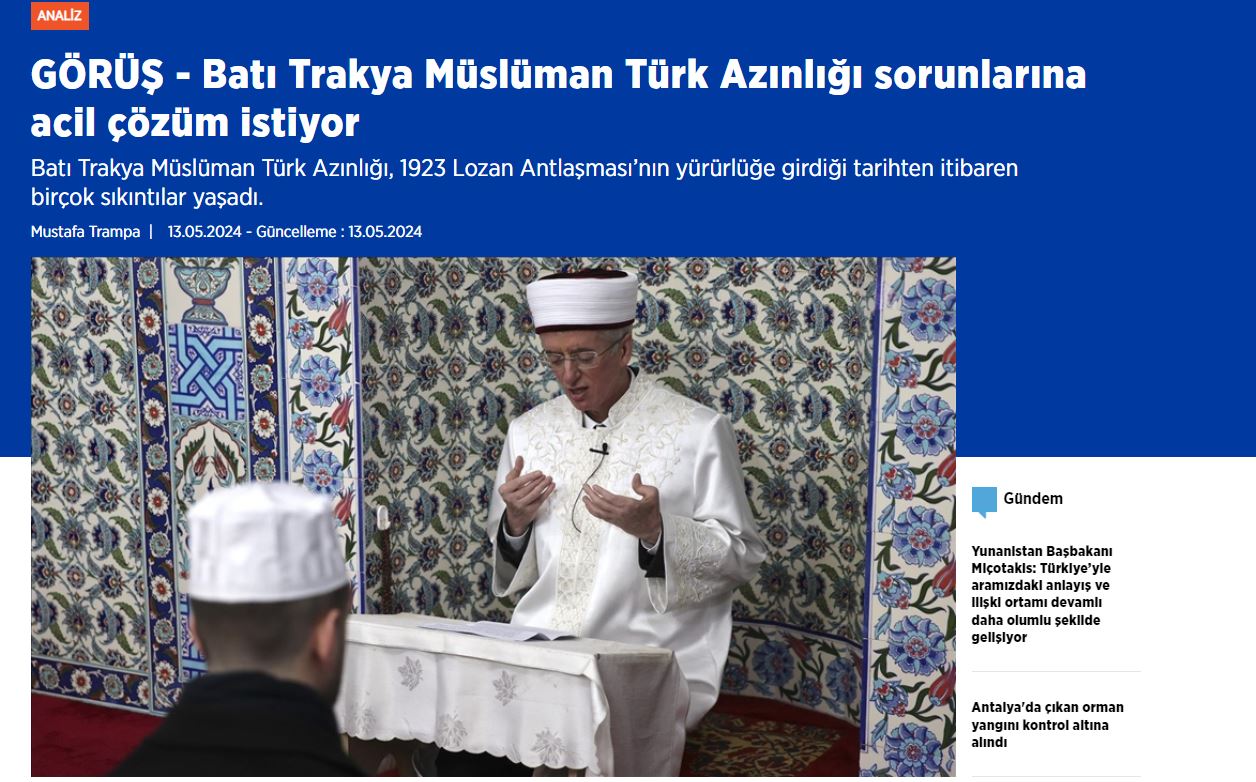 Προκαλεί ο ψευτομουφτής Ξάνθης, Μουσταφά Τράμπα, ο οποίος σε άρθρο του στο τουρκικό πρακτορείο ειδήσεων Anadolu, αποκαλεί τη μειονότητα της Θράκης ως «τουρκική» και αναφέρει πως «η μουσουλμανική τουρκική μειονότητα της Δυτικής Θράκης έχει βιώσει πολλές δυσκολίες από τότε που τέθηκε σε ισχύ η Συνθήκη της Λωζάνης το 1923». Μάλιστα τονίζει ότι «θέλει επείγουσα λύση στα προβλήματά της».