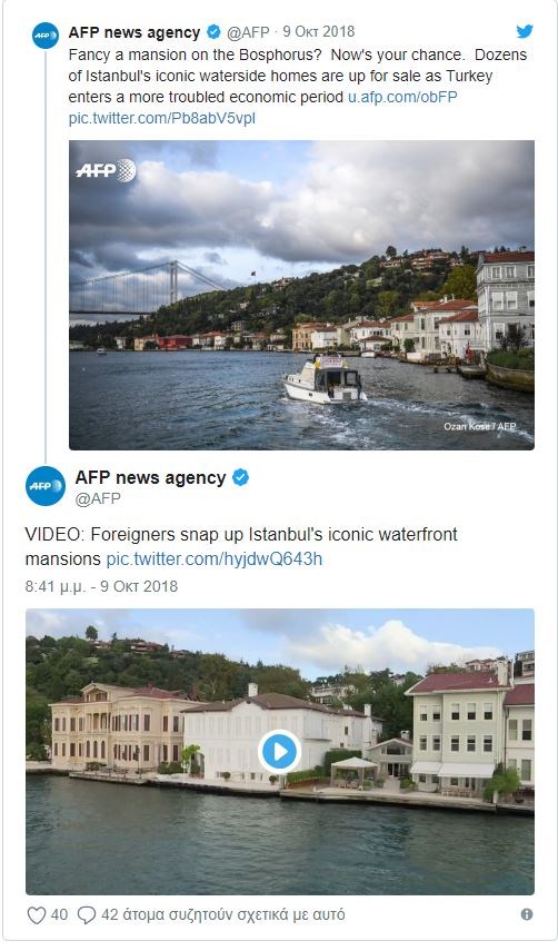 Προς πώληση έχουν βγει δεκάδες από τις εξακόσιες επαύλεις της Κωνσταντινούπολης που έχουν θέα τον Βόσπορο. Τα πολυτελή σπίτια, που συχνά φιλοξενούσαν γυρίσματα των διάσημων τουρκικών σίριαλ, είναι πλέον περιζήτητα, κυρίως μετά τον κατήφορο της τουρκικής λίρας.