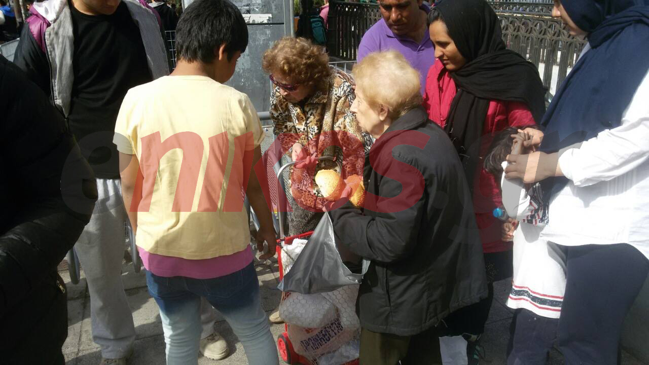 Ηλικιωμένες κυρίες προσφέρουν τρόφιμα, σήμερα το πρωί, σε μετανάστες που βρίσκονται στην πλατεία Βικτωρίας.