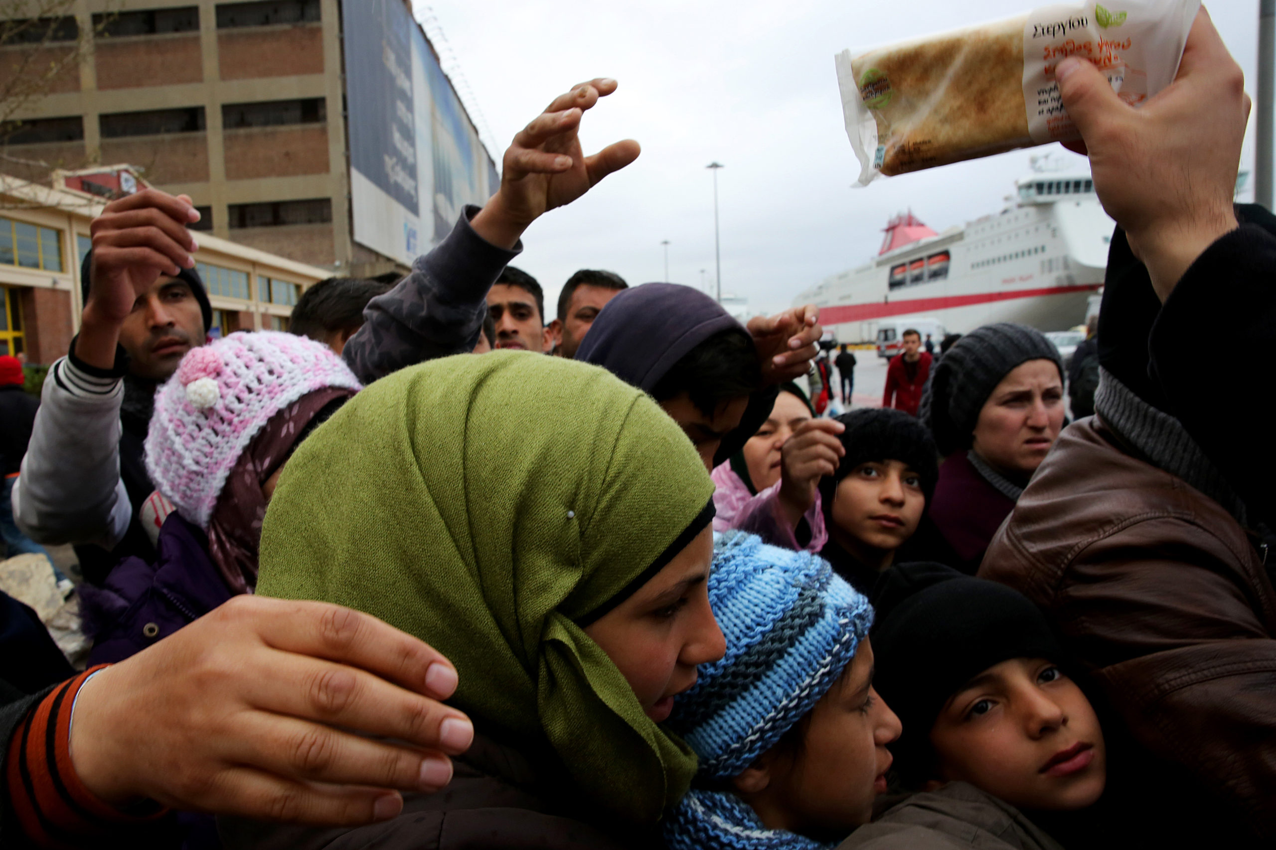 Πρόσφυγες δέχονται φαγητό από εθελοντές στον Πειραιά – Συγκλονιστικές εικόνες