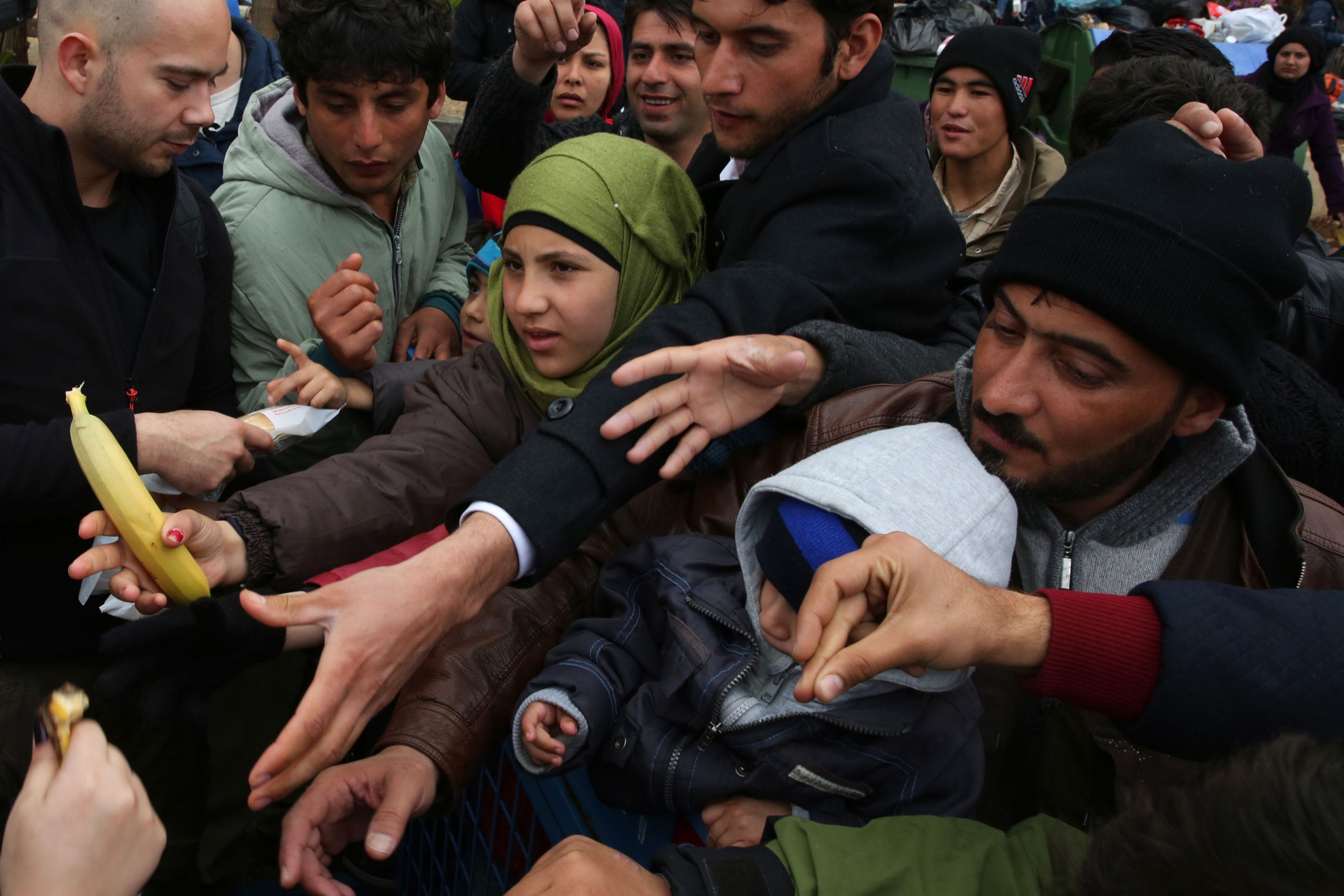 Πρόκειται για τους πρόσφυγες, οι οποίοι δέχονται τροφή από εθελοντές στο λιμάνι του Πειραιά.