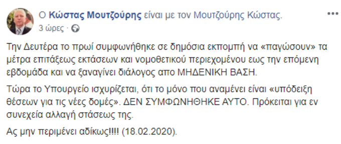 Ο κ. Μουτζούρης στην ανάρτηση του αναφέρει: «Την Δευτέρα το πρωί συμφωνήθηκε σε δημόσια εκπομπή να “παγώσουν” τα μέτρα επιτάξεως εκτάσεων και νομοθετικού περιεχομένου έως την επόμενη εβδομάδα και να ξαναγίνει διάλογος από ΜΗΔΕΝΙΚΗ ΒΑΣΗ. Τώρα το υπουργείο ισχυρίζεται, ότι το μόνο που αναμένει είναι “υπόδειξη θέσεων για τις νέες δομές”. ΔΕΝ ΣΥΜΦΩΝΗΘΗΚΕ ΑΥΤΟ. Πρόκειται για εν συνεχεία αλλαγή στάσεως της. Ας μην περιμένει αδίκως!».