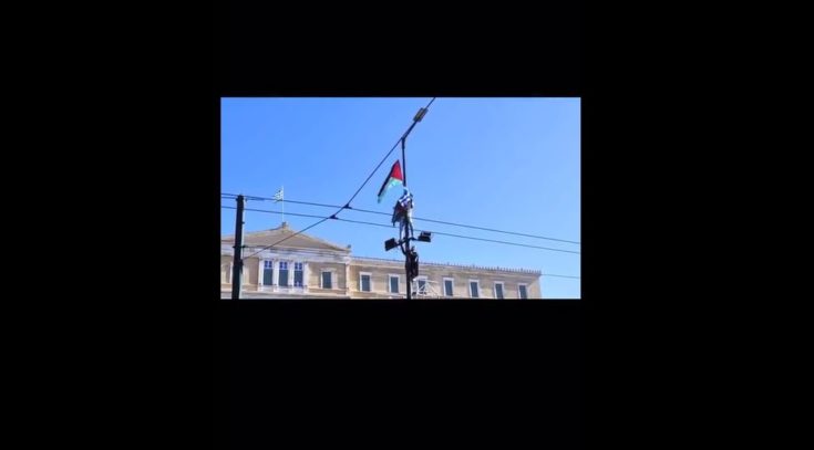 «Ύστερα από ενδελεχή έρευνα της Ελληνικής Αστυνομίας συνελήφθη το άτομο που την Κυριακή, στο πλαίσιο διαδήλωσης στο Σύνταγμα, τοποθέτησε παλαιστινιακή και κατόπιν ελληνική σημαία σε στύλο. Ο συλληφθείς παραπέμπεται στη Δικαιοσύνη.