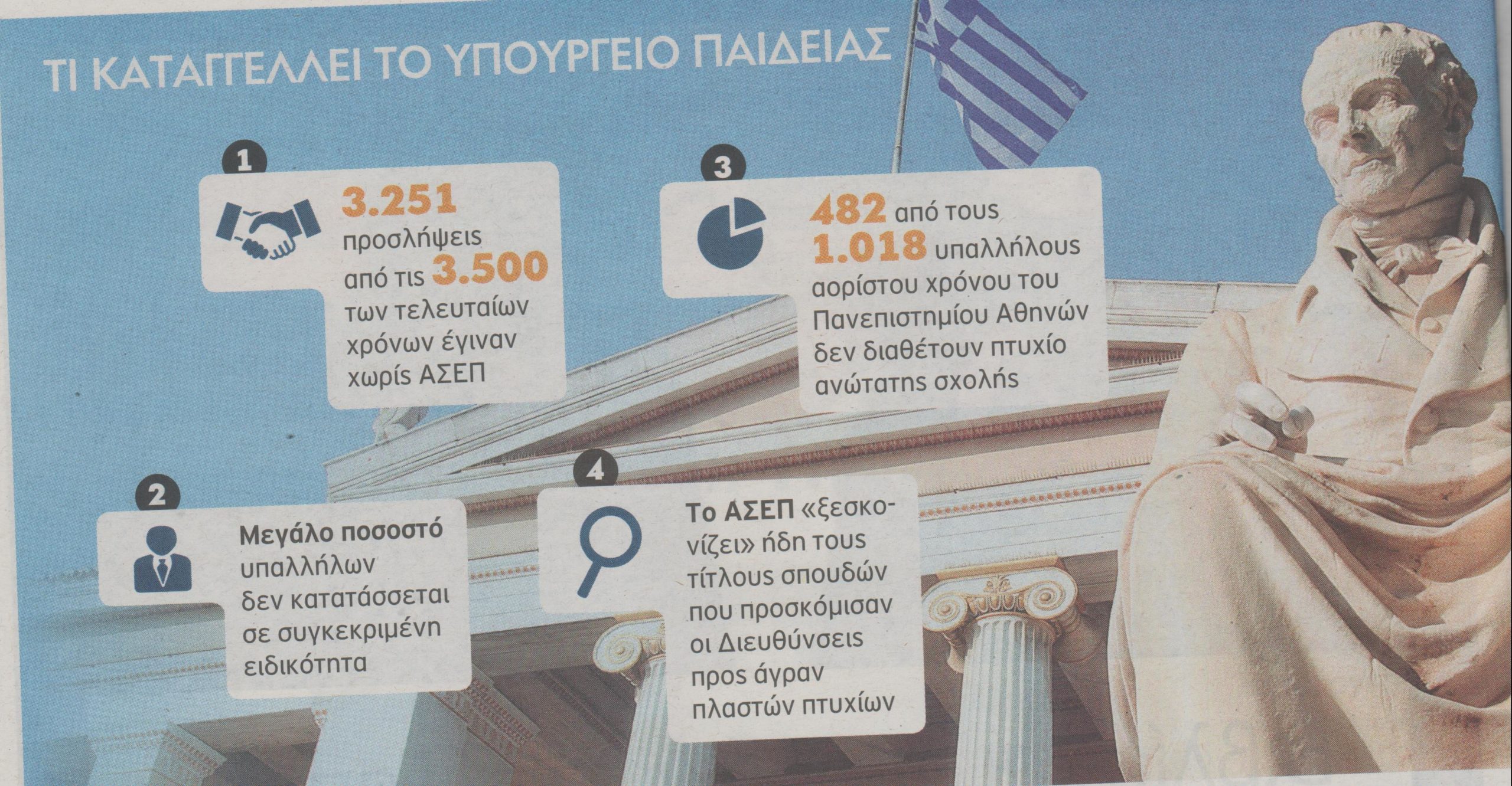 Είναι χαρακτηριστικό ότι, τα τελευταία χρόνια, από τις 3.500 προσλήψεις διοικητικών υπαλλήλων που έγιναν στα πανεπιστήμια της χώρας, μόλις οι 249 από αυτές (ποσοστό 7%) πραγματοποιήθηκαν, μέσω ΑΣΕΠ.