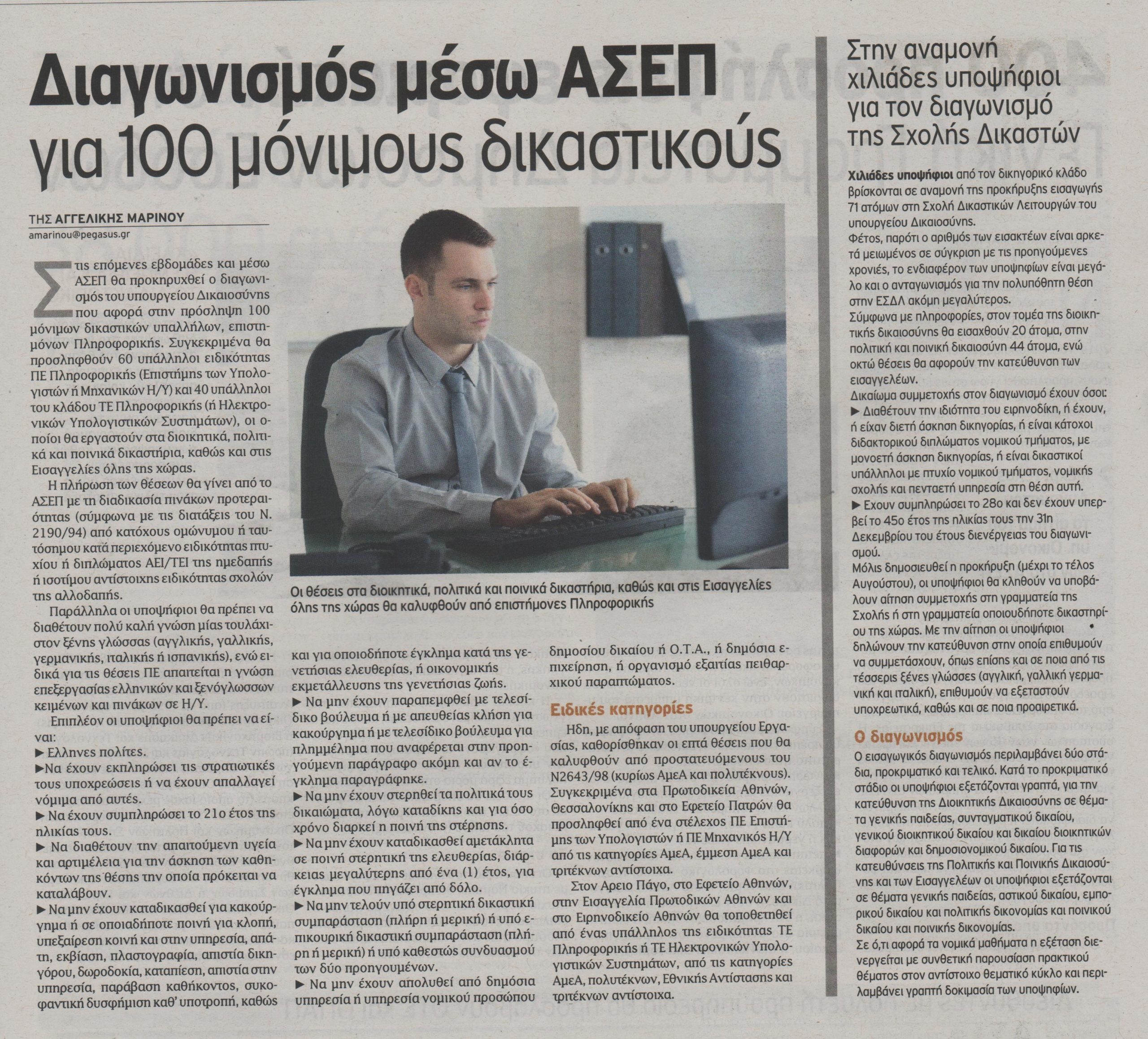 Μέσω ΑΣΕΠ θα προκηρυχθεί μέσα στις επόμενες εβδομάδες και ο διαγωνισμός του υπουργείου Δικαιοσύνης για 100 μόνιμους δικαστικούς υπαλλήλους, επιστήμονες Πληροφορικής.