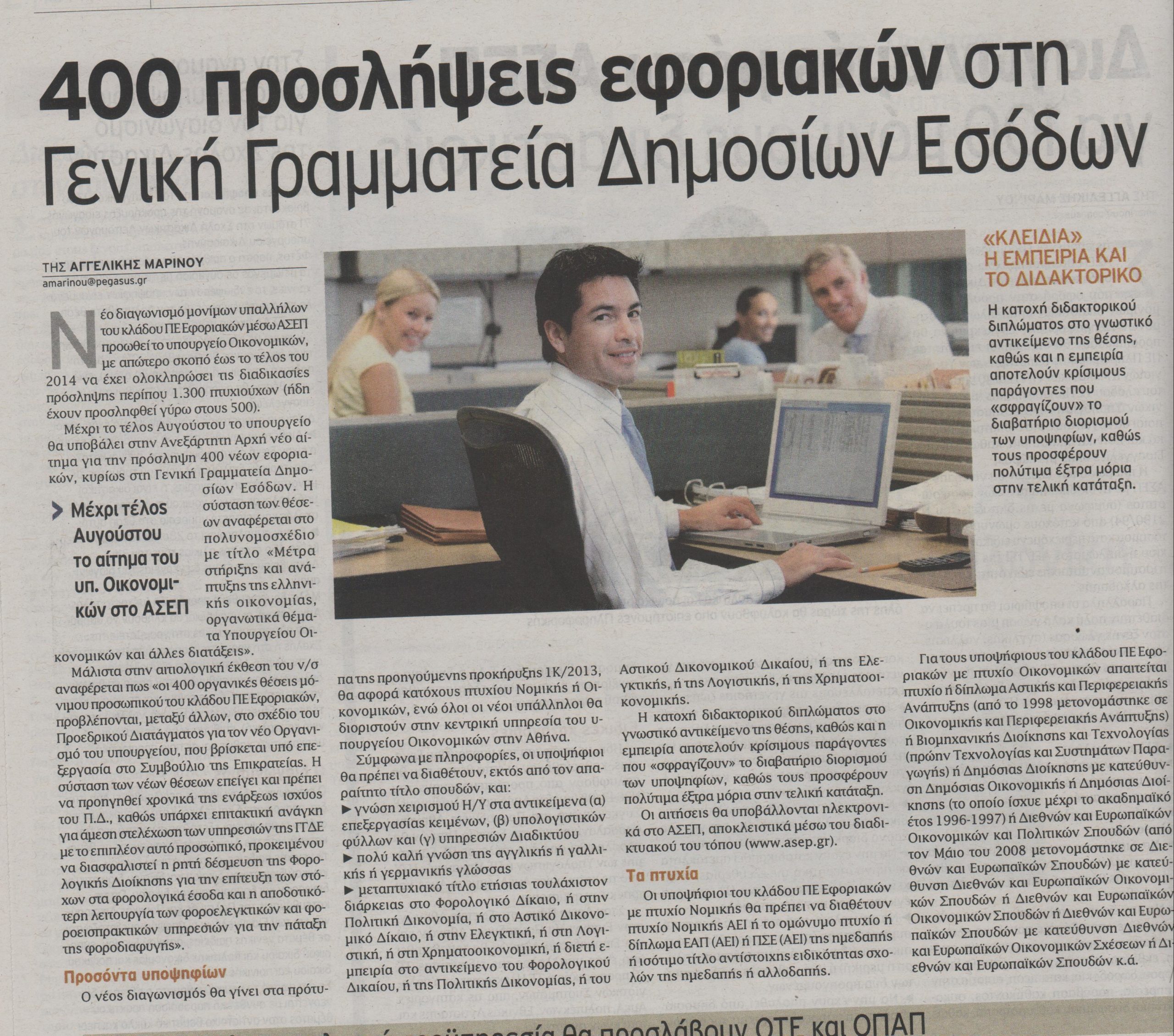 Μέχρι το τέλος Αυγούστου, το υπουργείο θα υποβάλει στο ΑΣΕΠ νέο αίτημα για την πρόσληψη 400 εφοριακών, κυρίως στη Γενική Γραμματεία Δημοσίων Εσόδων.