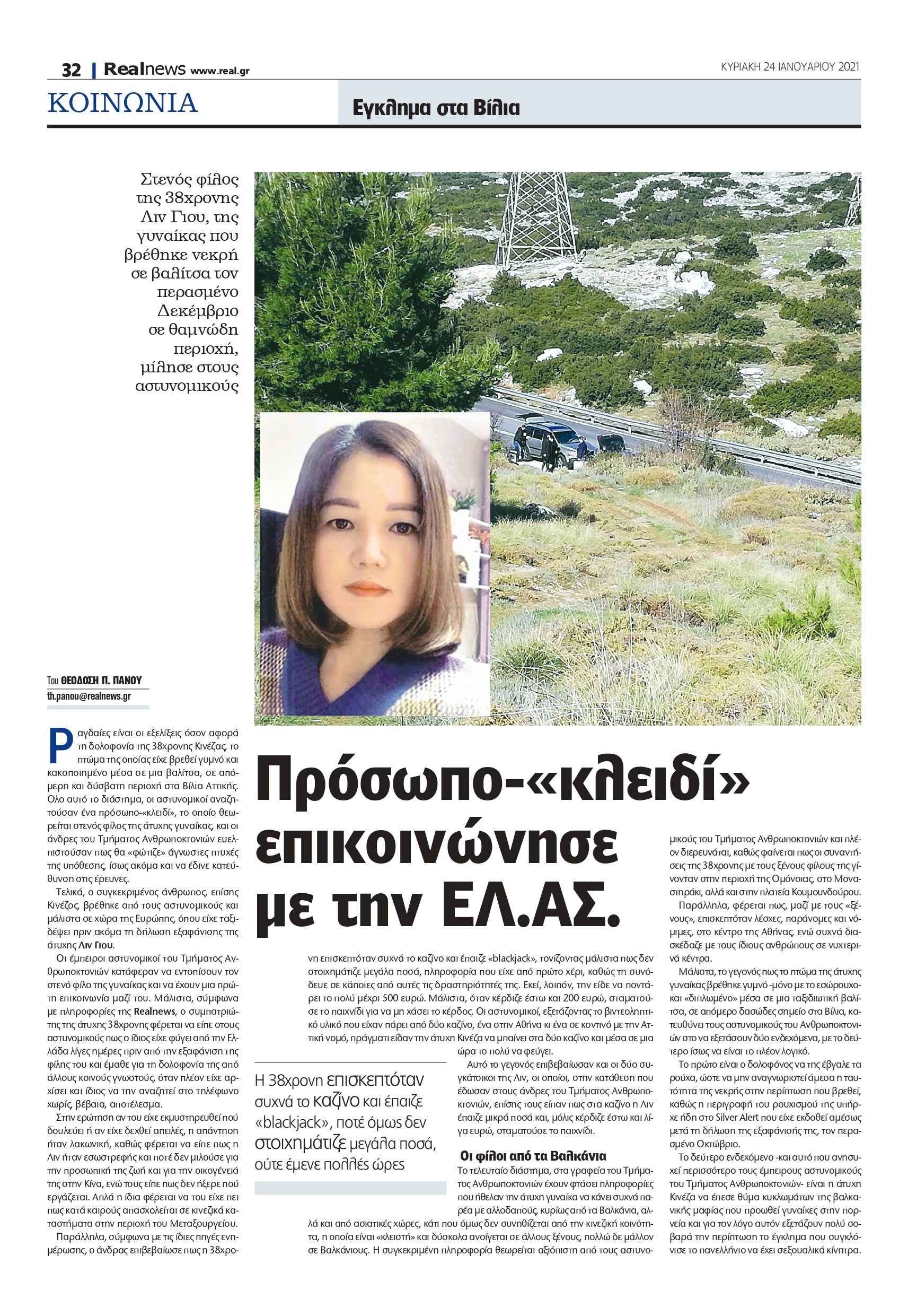 Ραγδαίες είναι οι εξελίξεις όσον αφορά τη δολοφονία της 38χρονης Κινέζας, το πτώμα της οποίας είχε βρεθεί γυμνό και κακοποιημένο μέσα σε μια βαλίτσα, σε απόμερη και δύσβατη περιοχή στα Βίλια Αττικής. Ολο αυτό το διάστημα, οι αστυνομικοί αναζητούσαν ένα πρόσωπο-«κλειδί», το οποίο θεωρείται στενός φίλος της άτυχης γυναίκας, και οι άνδρες του Τμήματος Ανθρωποκτονιών ευελπιστούσαν πως θα «φώτιζε» άγνωστες πτυχές της υπόθεσης, ίσως ακόμα και να έδινε κατεύθυνση στις έρευνες. Τελικά, ο συγκεκριμένος άνθρωπος, επίσης Κινέζος, βρέθηκε από τους αστυνομικούς και μάλιστα σε χώρα της Ευρώπης, όπου είχε ταξιδέψει πριν ακόμα τη δήλωση εξαφάνισης της άτυχης Λιν Γιου. Οι έμπειροι αστυνομικοί του Τμήματος Ανθρωποκτονιών κατάφεραν να εντοπίσουν τον στενό φίλο της γυναίκας και να έχουν μια πρώτη επικοινωνία μαζί του. Μάλιστα, σύμφωνα με πληροφορίες της Realnews, ο συμπατριώτης της άτυχης 38χρονης φέρεται να είπε στους αστυνομικούς πως ο ίδιος είχε φύγει από την Ελλάδα λίγες ημέρες πριν από την εξαφάνιση της φίλης του και έμαθε για τη δολοφονία της από άλλους κοινούς γνωστούς, όταν πλέον είχε αρχίσει και ίδιος να την αναζητεί στο τηλέφωνο χωρίς, βέβαια, αποτέλεσμα. Στην ερώτηση αν του είχε εκμυστηρευθεί πού δουλεύει ή αν είχε δεχθεί απειλές, η απάντηση ήταν λακωνική, καθώς φέρεται να είπε πως η Λιν ήταν εσωστρεφής και ποτέ δεν μιλούσε για την προσωπική της ζωή και για την οικογένειά της στην Κίνα, ενώ τους είπε πως δεν ήξερε πού εργάζεται. Απλά η ίδια φέρεται να του είχε πει πως κατά καιρούς απασχολείται σε κινεζικά καταστήματα στην περιοχή του Μεταξουργείου. Παράλληλα, σύμφωνα με τις ίδιες πηγές ενημέρωσης, ο άνδρας επιβεβαίωσε πως η 38χρονη επισκεπτόταν συχνά το καζίνο και έπαιζε «blackjack», τονίζοντας μάλιστα πως δεν στοιχημάτιζε μεγάλα ποσά, πληροφορία που είχε από πρώτο χέρι, καθώς τη συνόδευε σε κάποιες από αυτές τις δραστηριότητές της. Εκεί, λοιπόν, την είδε να ποντάρει το πολύ μέχρι 500 ευρώ. Μάλιστα, όταν κέρδιζε έστω και 200 ευρώ, σταματούσε το παιχνίδι για να μη χάσει το κέρδος. Οι αστυνομικοί, εξετάζοντας το βιντεοληπτικό υλικό που είχαν πάρει από δύο καζίνο, ένα στην Αθήνα κι ένα σε κοντινό με την Αττική νομό, πράγματι είδαν την άτυχη Κινέζα να μπαίνει στα δύο καζίνο και μέσα σε μια ώρα το πολύ να φεύγει. Αυτό το γεγονός επιβεβαίωσαν και οι δύο συγκάτοικοι της Λιν, οι οποίοι, στην κατάθεση που έδωσαν στους άνδρες του Τμήματος Ανθρωποκτονιών, επίσης τους είπαν πως στα καζίνο η Λιν έπαιζε μικρά ποσά και, μόλις κέρδιζε έστω και λίγα ευρώ, σταματούσε το παιχνίδι.Διαβάστε περισσότερα στο δημοσίευμα της Realnews