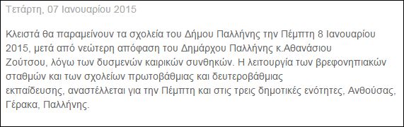 Σημειώνεται ότι η πρώτη ανακοίνωση ανέφερε ότι τα σχολεία του δήμου θα ξεκινούσαν στις 10:00 π.μ ωστόσο πριν από λίγο αποφασίστηκε να παραμείνουν κλειστά.