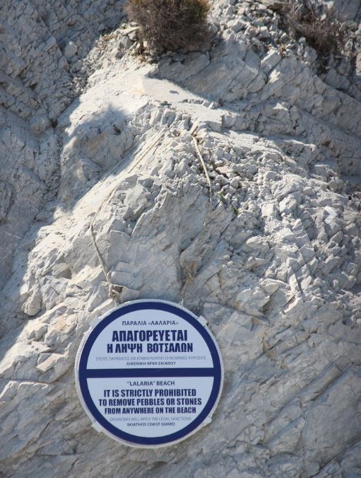 “Πάρτε φωτογραφίες, όχι βότσαλα” προτρέπουν τους τουρίστες, που επισκέπτονται την παραλία Λαλάρια στη Σκιάθο, μέλη του τοπικού πολιτιστικού συλλόγου, που βλέπουν να αλλοιώνεται η εικόνα της γραφικής παραλίας με την αφαίρεση των χαρακτηριστικών βότσαλων.