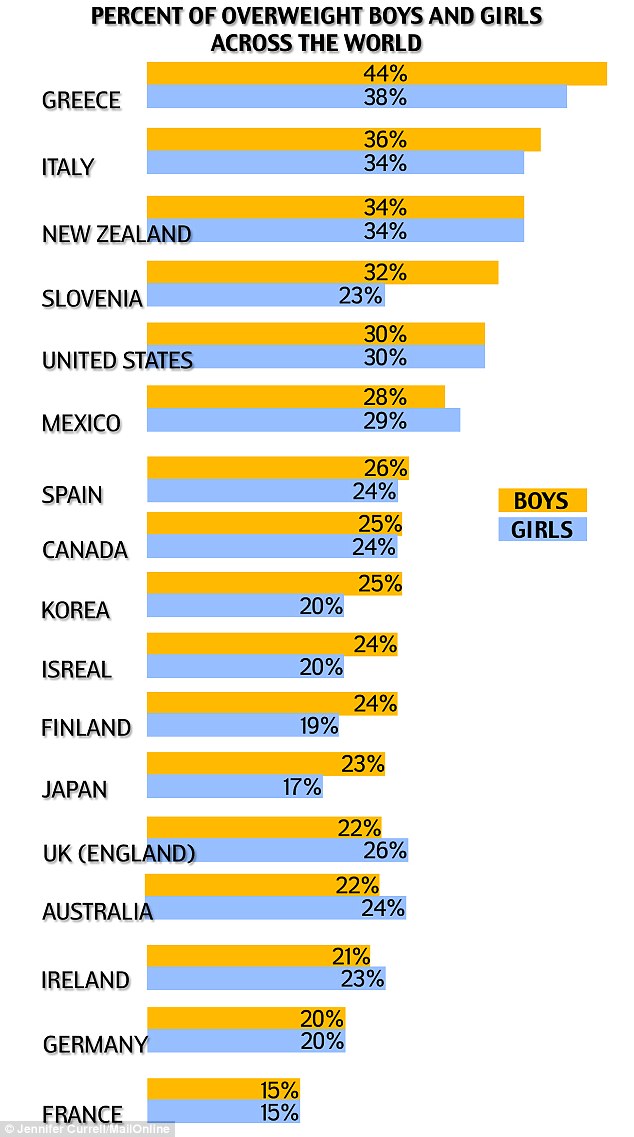Αναλυτικότερα, περίπου το 30% των παιδιών από 5 εως 17 ετών στην Αμερική είναι υπέρβαρα ή παχύσαρκα ενώ στην Ελλάδα, υπέρβαρα ή παχύσαρκα είναι το 44% των αγοριών και το 38% των κοριτσιών. Στην Ιταλία, το ποσοστό είναι 36% για τα αγόρια και 34% για τα κορίτσια.