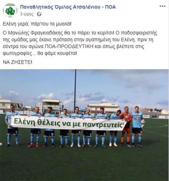 Λίγο πριν από τη σέντρα της αναμέτρησης του Ατσαλένιου με την Προοδευτική, στη Γ Εθνική, ένας παίκτης αποφάσισε να κάνει πρόταση γάμου στην εκλεκτή της καρδιά του.