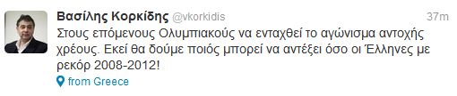 ”Στους επόμενους Ολυμπιακούς να ενταχθεί το αγώνισμα αντοχής χρέους. Εκεί θα δούμε ποιός μπορεί να αντέξει όσο οι Έλληνες με ρεκόρ 2008-2012!”, γράφει στο twitter του, ο Βασίλης Κορκίδης.
