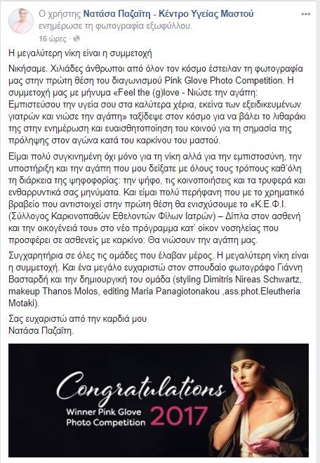 Νικήσαμε. Χιλιάδες άνθρωποι από όλον τον κόσμο έστειλαν τη φωτογραφία μας στην πρώτη θέση του διαγωνισμού Pink Glove Photo Competition. Η συμμετοχή μας με μήνυμα «Feel the (g)love – Νιώσε την αγάπη: Εμπιστεύσου την υγεία σου στα καλύτερα χέρια, εκείνα των εξειδικευμένων γιατρών και νιώσε την αγάπη», ταξίδεψε στον κόσμο για να βάλει το λιθαράκι της στην ενημέρωση και ευαισθητοποίηση του κοινού για τη σημασία της πρόληψης στον αγώνα κατά του καρκίνου του μαστού.