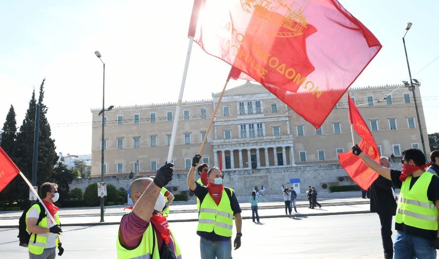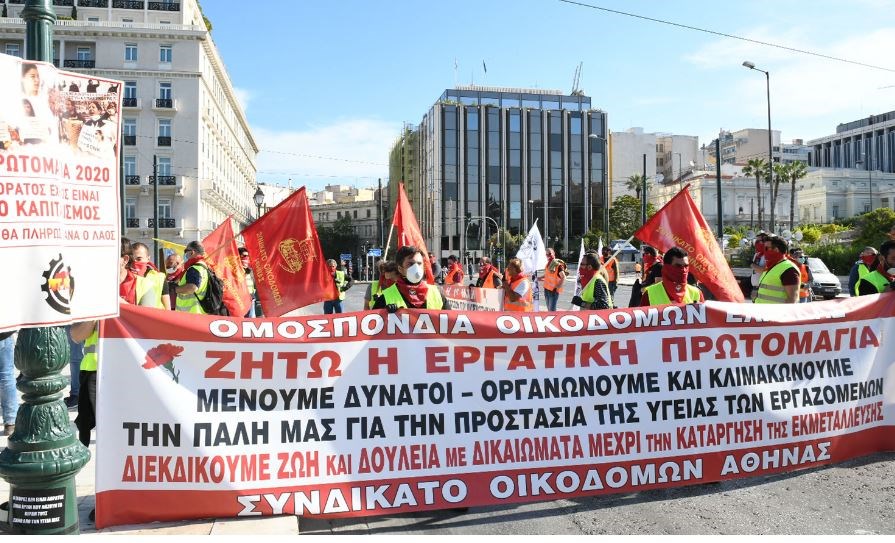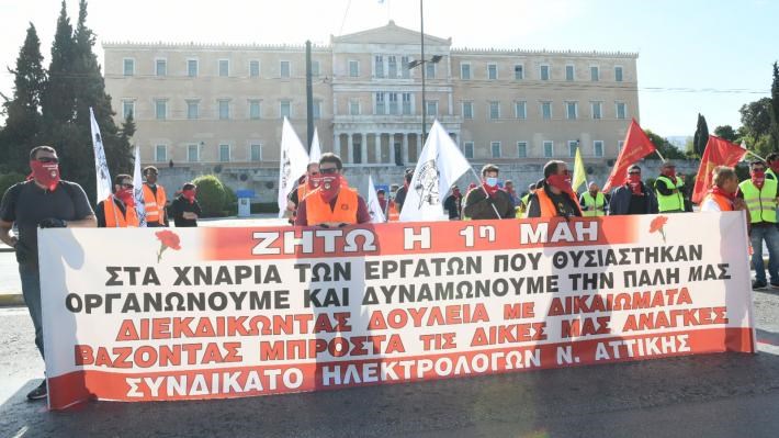 Στο Σύνταγμα βρίσκονται μέλη των Σωματείων για να λάβουν μέρος στις διαδηλώσεις για την εργατική Πρωτομαγιά. Κρατώντας πανό και σημαίες, φορώντας μάσκες και τηρώντας τις απαραίτητες αποστάσεις λόγω των μέτρων για τον κορονοϊό τα μέλη των Σωματείων έχουν πάρει τη θέση τους στην πλατεία Συντάγματος.