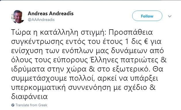 Μια πολύ σημαντική πρωτοβουλία αναλαμβάνει ο επίτιμος πρόεδρος του ΣΕΤΕ και διευθύνων σύμβουλος της Sani/Ikos Ανδρέας Ανδρεάδης.Με αφορμή τη συζήτηση που έχει ανοίξει μετά τη συντριβή του μοιραίου Mirage 2000-5 που στοίχισε τη ζωή στον Γιώργο Μπαλταδώρο, αναφορικά με τις ελλείψεις στις Ένοπλες Δυνάμεις και την καταπόνηση που υφίστανται το τελευταίο διάστημα οι Έλληνες πιλότοι της Πολεμικής Αεροπορίας, ο κ. Ανδρεάδης ξεκινά μια προσπάθεια για να κινητοποιήσει τους εύπορους Έλληνες και ιδρύματα. Στόχος εντός του έτους να συγκεντρωθεί το ποσό του 1 δισ. ευρώ για την ενίσχυση των Ενόπλων Δυνάμεων.«Τώρα η κατάλληλη στιγμή: Προσπάθεια συγκέντρωσης εντός του έτους 1 δισ. € για ενίσχυση των Ενόπλων μας Δυνάμεων από όλους τους εύπορους Έλληνες πατριώτες και ιδρύματα στη χώρα και στο εξωτερικό. Θα συμμετάσχουμε πολλοί, αρκεί να υπάρξει υπερκομματική συνεννόηση με σχέδιο και διαφάνεια» έγραψε στο Twitter ο επίτιμος πρόεδρος του ΣΕΤΕ και διευθύνων σύμβουλος της Sani/Ikos.