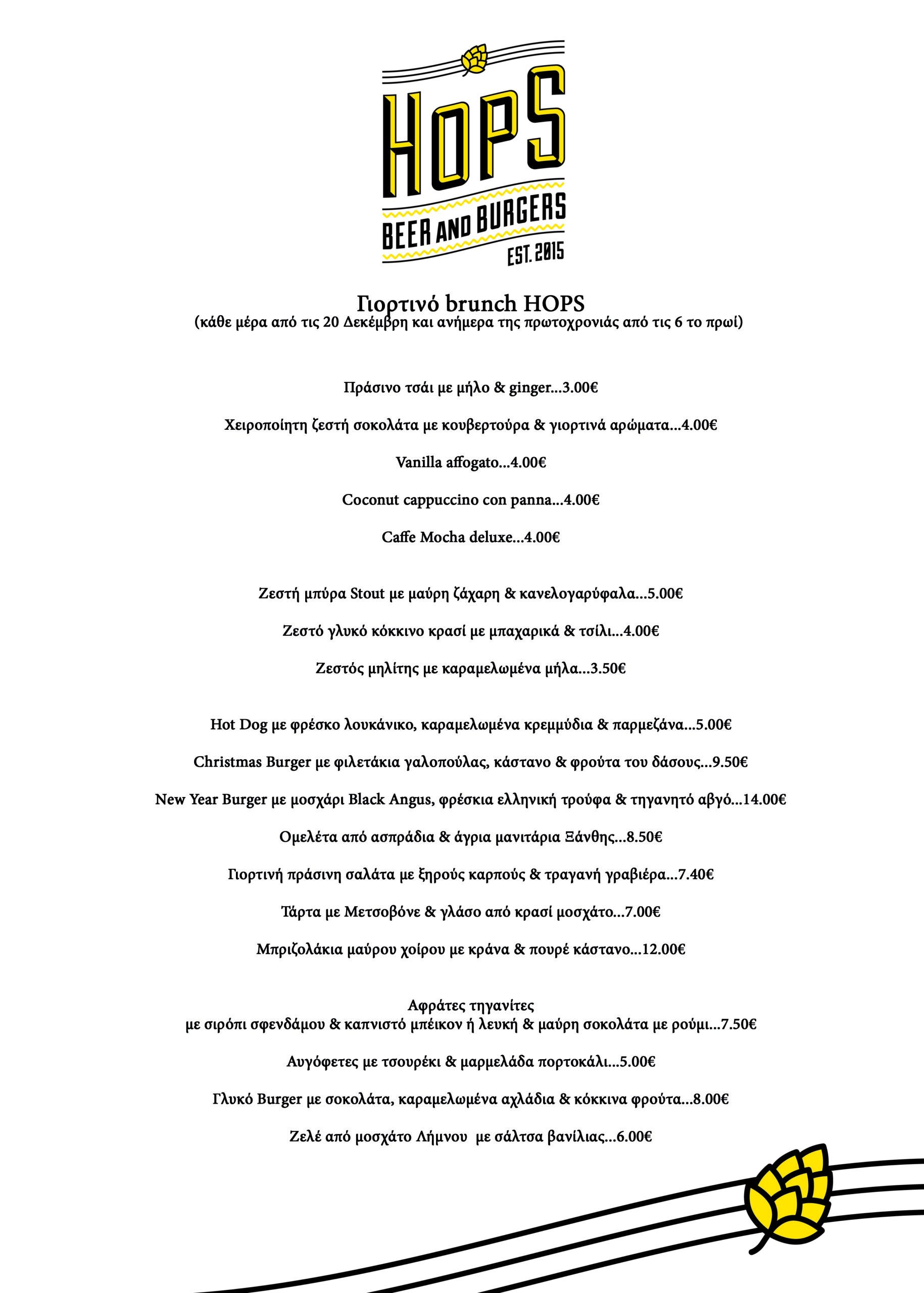 Το HOPS υποδέχεται τις γιορτές με ένα ειδικό μενού brunch που σερβίρεται όλη μέρα αλλά και ανήμερα τη Πρωτοχρονιά από τις 6 το πρωί. Τίποτα καλύτερο για μετά το ρεβεγιόν.