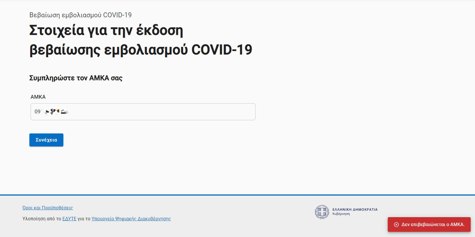 Σύμφωνα με καταγγελίες αναγνωστών στο enikos.gr, ενώ μπαίνουν κανονικά στη σελίδα του gov.gr και φθάνουν στο πεδίο, όπου απαιτείται να συμπληρώσουν τον ΑΜΚΑ τους, εκεί “κολλάει” η διαδικασία. Συγκεκριμένα, ενώ γράφουν τον σωστό αριθμό, από κάτω εμφανίζεται μία ένδειξη σε κόκκινο πλαίσιο που αναφέρει: “Δεν επιβεβαιώνεται ο ΑΜΚΑ” με αποτέλεσμα να μην μπορούν να εκδώσουν το πιστοποιητικό.