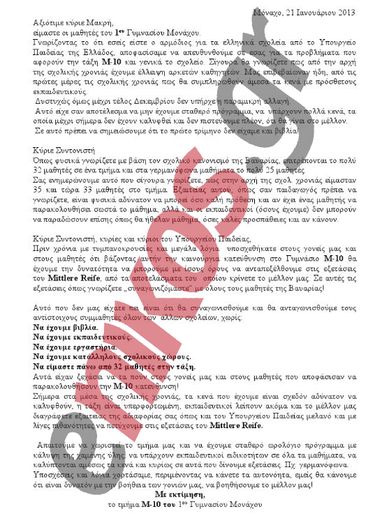 Συγκεκριμένα, όπως μας ενημερώνει αναγνώστρια, οι μαθητές το 1ου Γυμνασίου Μονάχου, έστειλαν επιστολή στο υπουργείο παιδείας , προκειμένου να βρουν λύση στις ελλείψεις που αντιμετωπίζουν σε εκπαιδευτικό προσωπικό αλλά και υλικοτεχνική υποδομή.